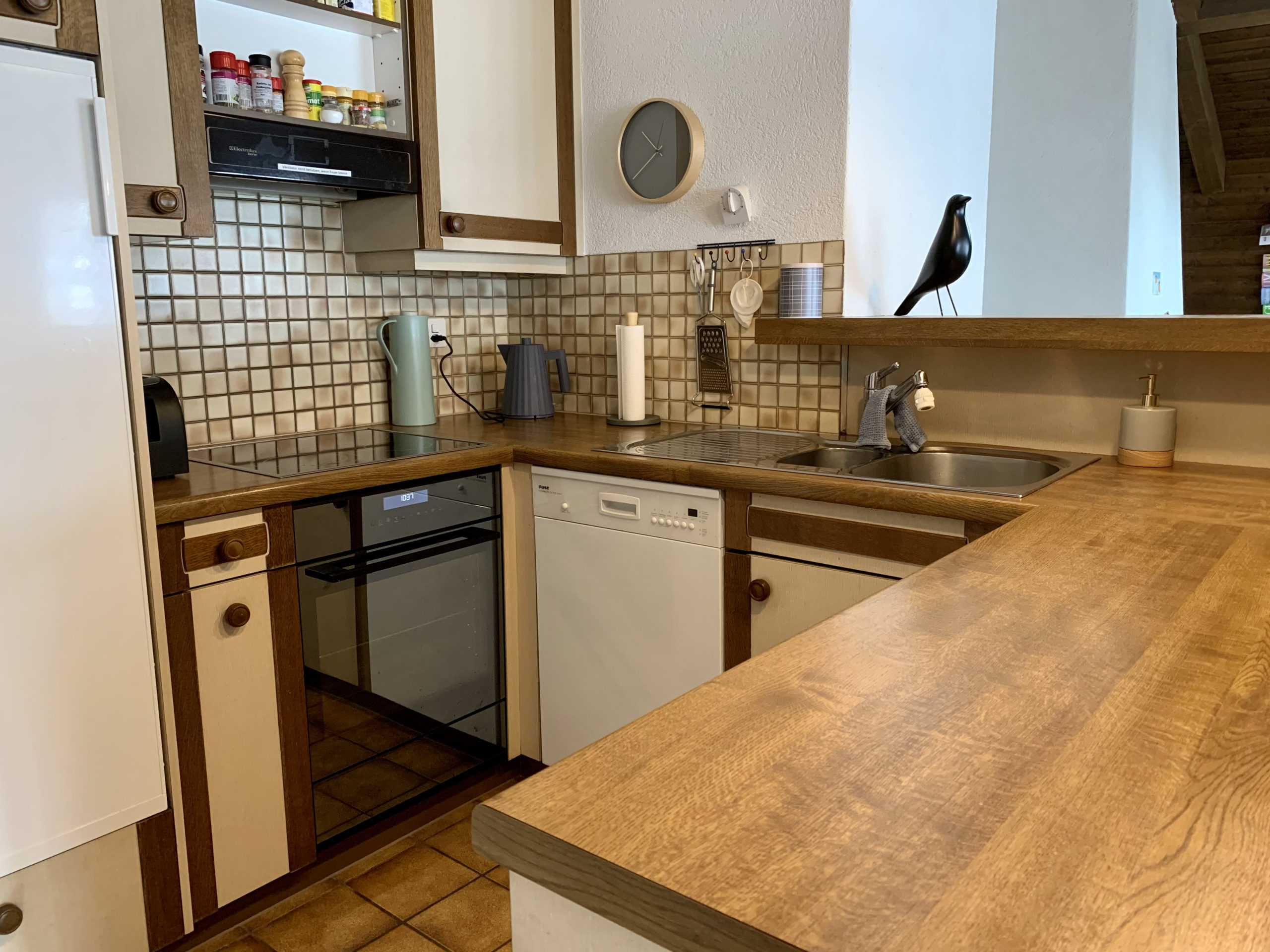 Die einfache Küche ist voll ausgestattet für den täglichen Gebrauch inklusive Backofen und Geschirrspüler. Der Essbereich bietet Platz für alle Gäste. Auf dem herrlichen Sonnenbalkon lässt sich die Bergkulisse geniessen.