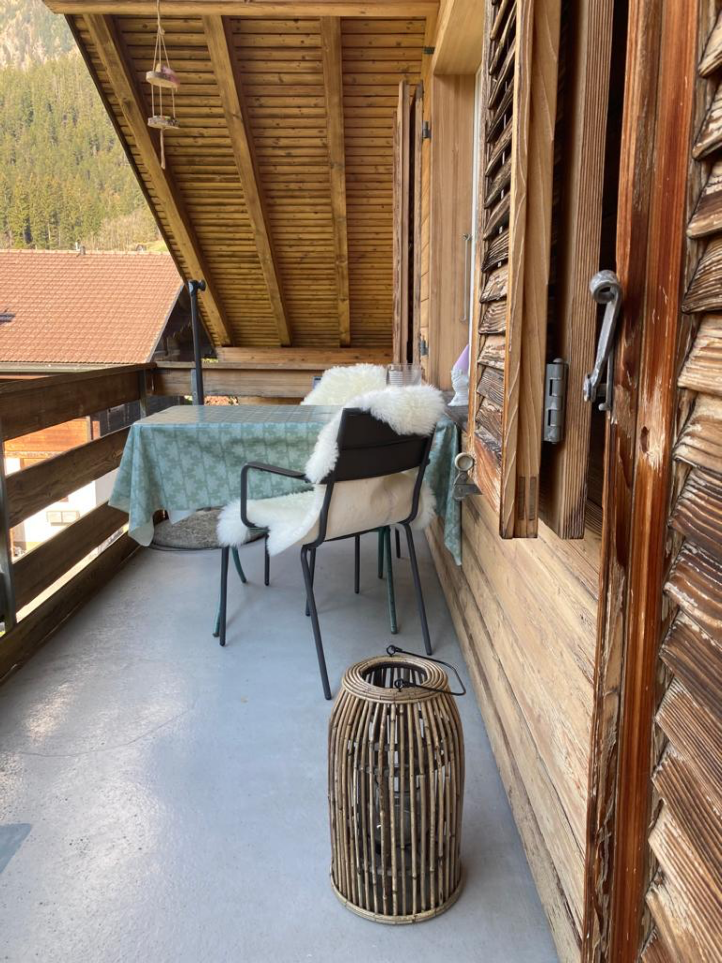 Auf dem herrlichen Sonnenbalkon lässt sich die Bergkulisse geniessen. Am Morgen ist es im Sommer noch schön kühl und schattig. Zum Abendessen bereits wieder angenehm warm. Es gibt einen Tisch für vier Erwachsene und einen kleinen Tisch für vier Kinder.